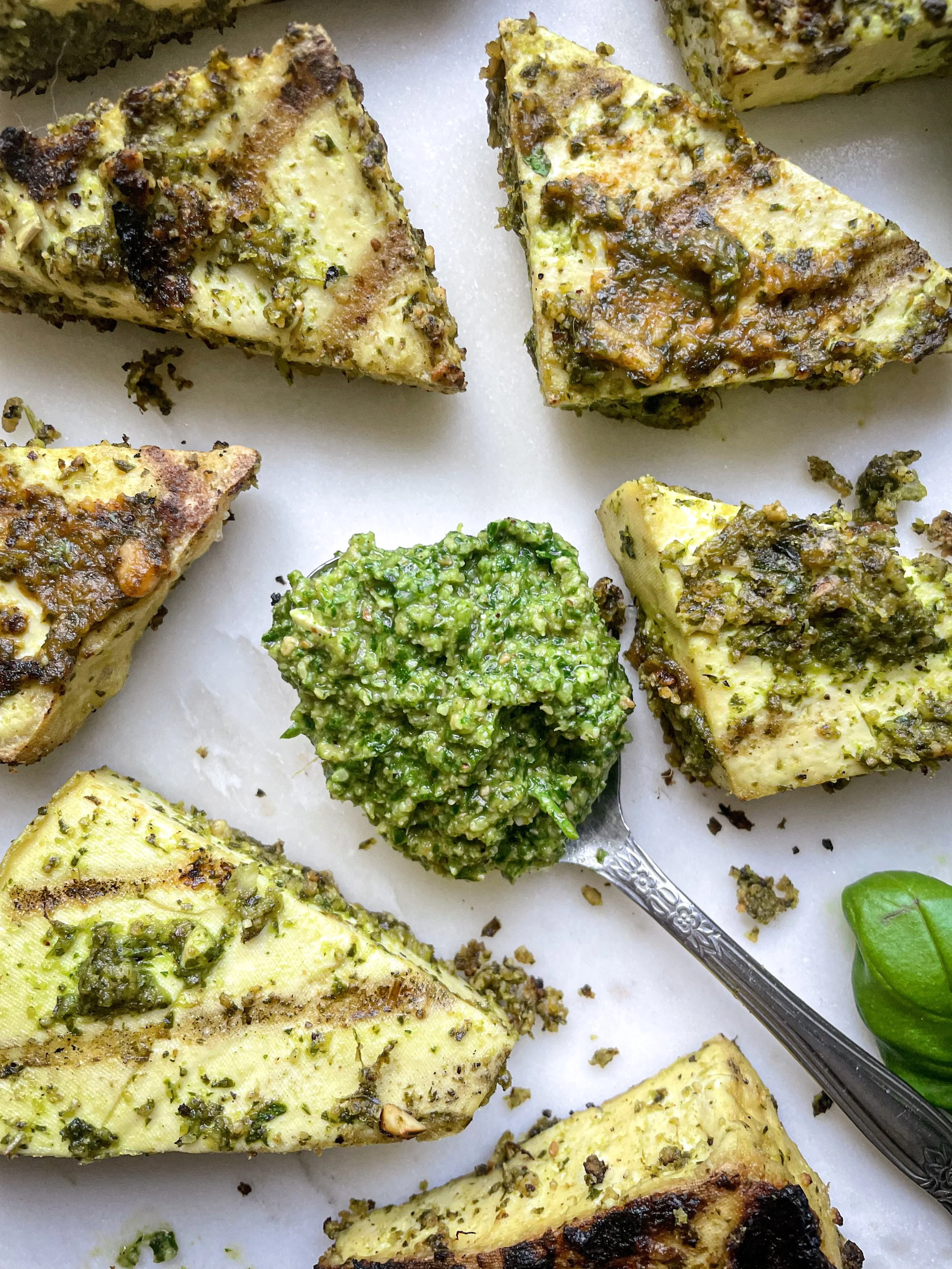 Cette recette est parfaite pour votre tofu sur le bbq. Il vous suffira d’un bloc de tofu ferme de 200g, de le couper en triangle (voir la photo) et le laisser reposer avec le pesto dans un bol à couvercle toute la nuit dans le frigidaire.