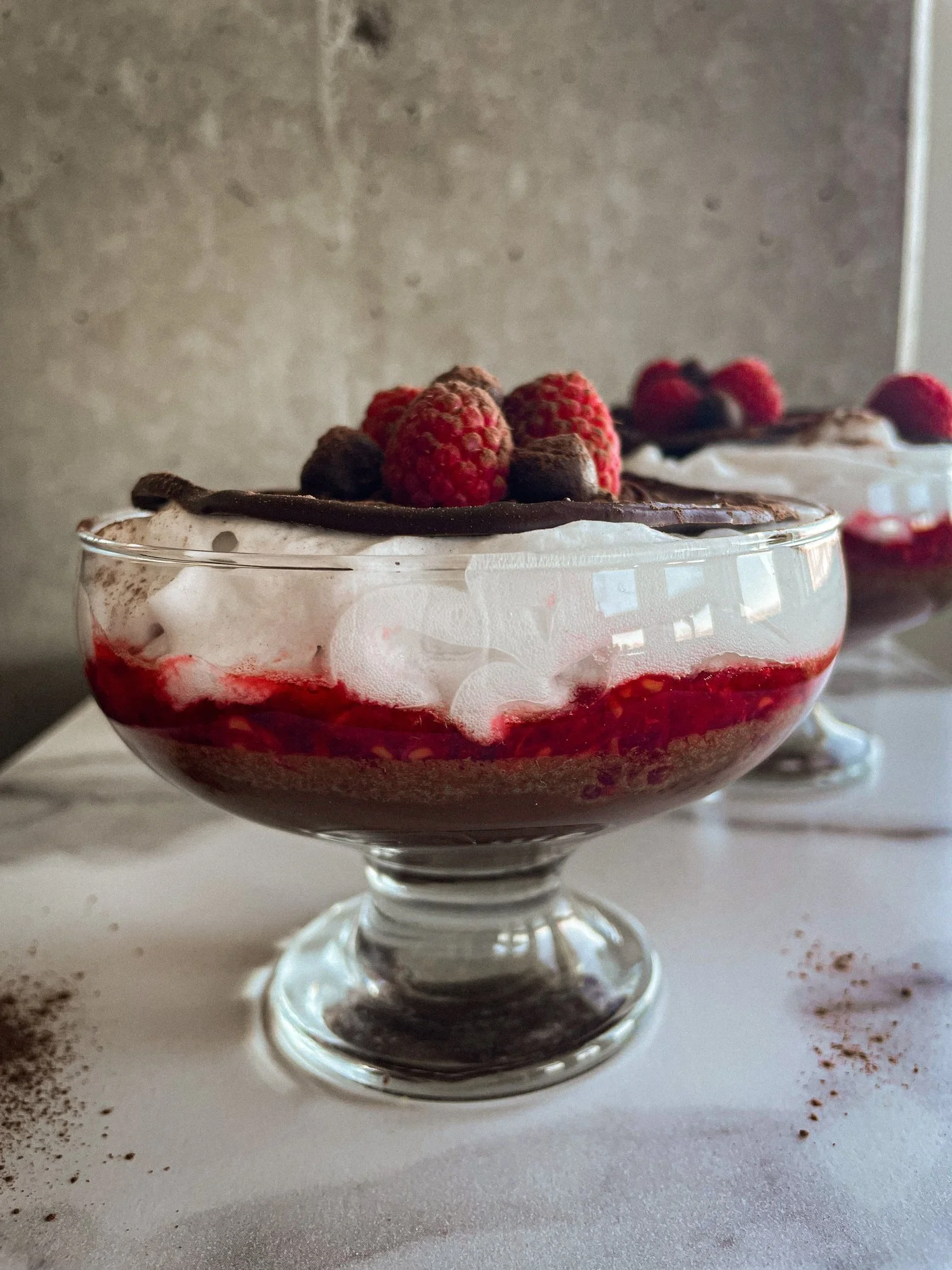 Un dessert rapide et délicieux pour vos invités. Ici, j’ai utilisé des framboises, mais vous pouvez également opter pour des cerises, comme dans le classique gâteau forêt noire. Les proportions peuvent varier selon la recette de mousse que vous utilisez.
