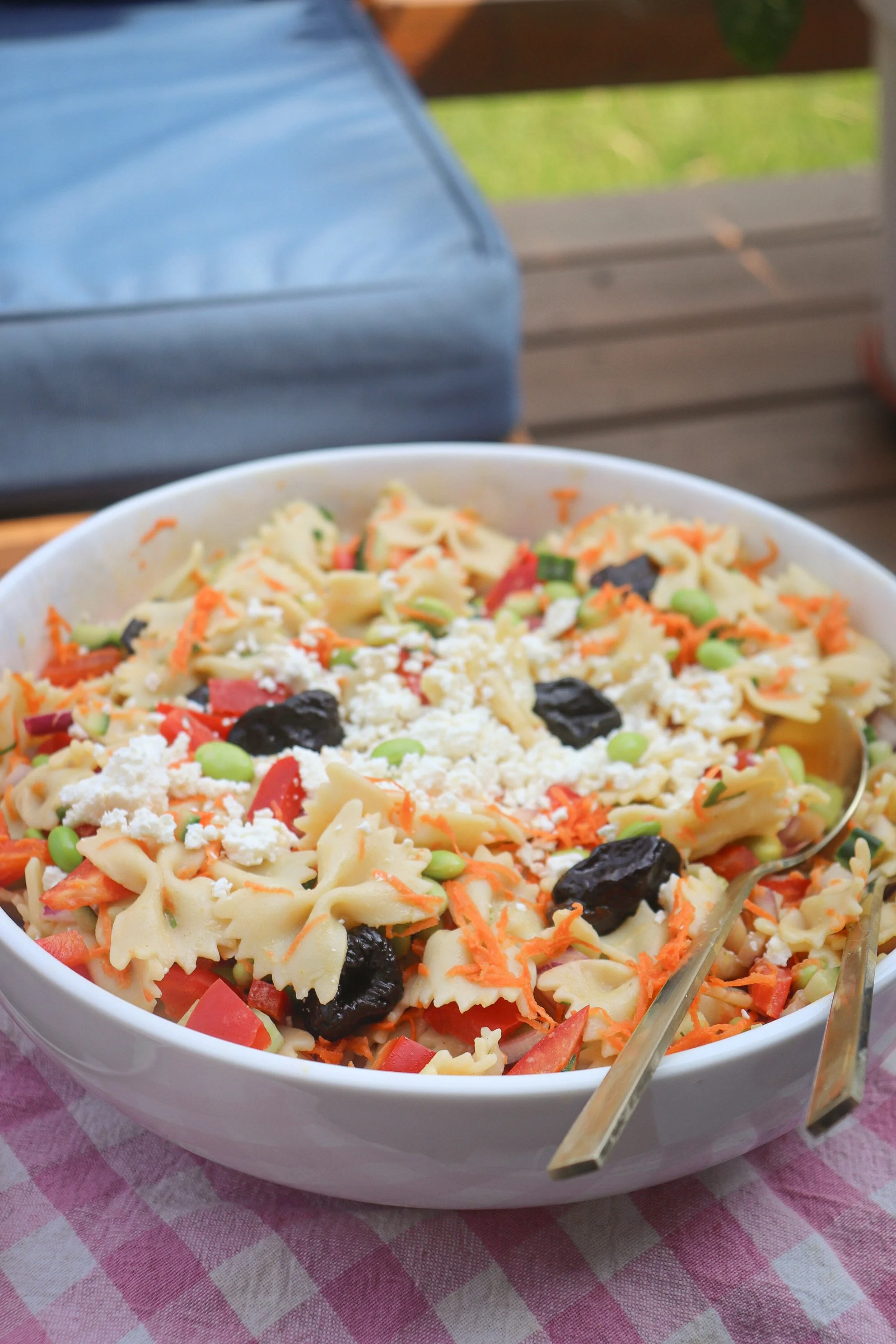 Salade de farfalle colorée aux pruneaux, edamame et vinaigrette érable-moutarde