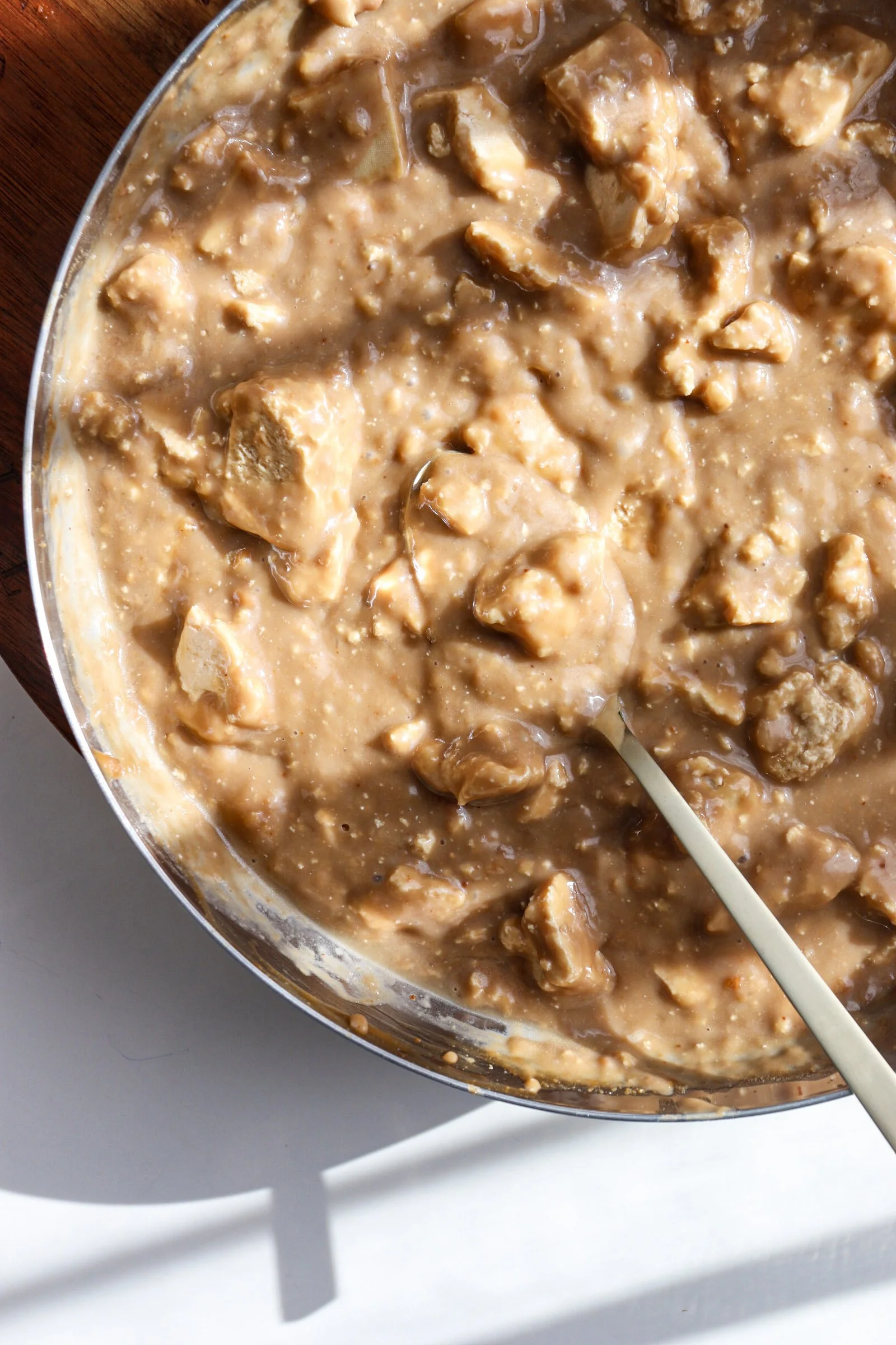 Le beurre d’arachide apporte ce côté riche et enveloppant, la sauce est ultra crémeuse, bien salée juste comme il faut, et chaque bouchée goûte le confort. C’est le genre de plat que tu manges sur le coin du comptoir, en legging, pendant que la cuisine sent tellement bon que ça calme déjà ton système nerveux.