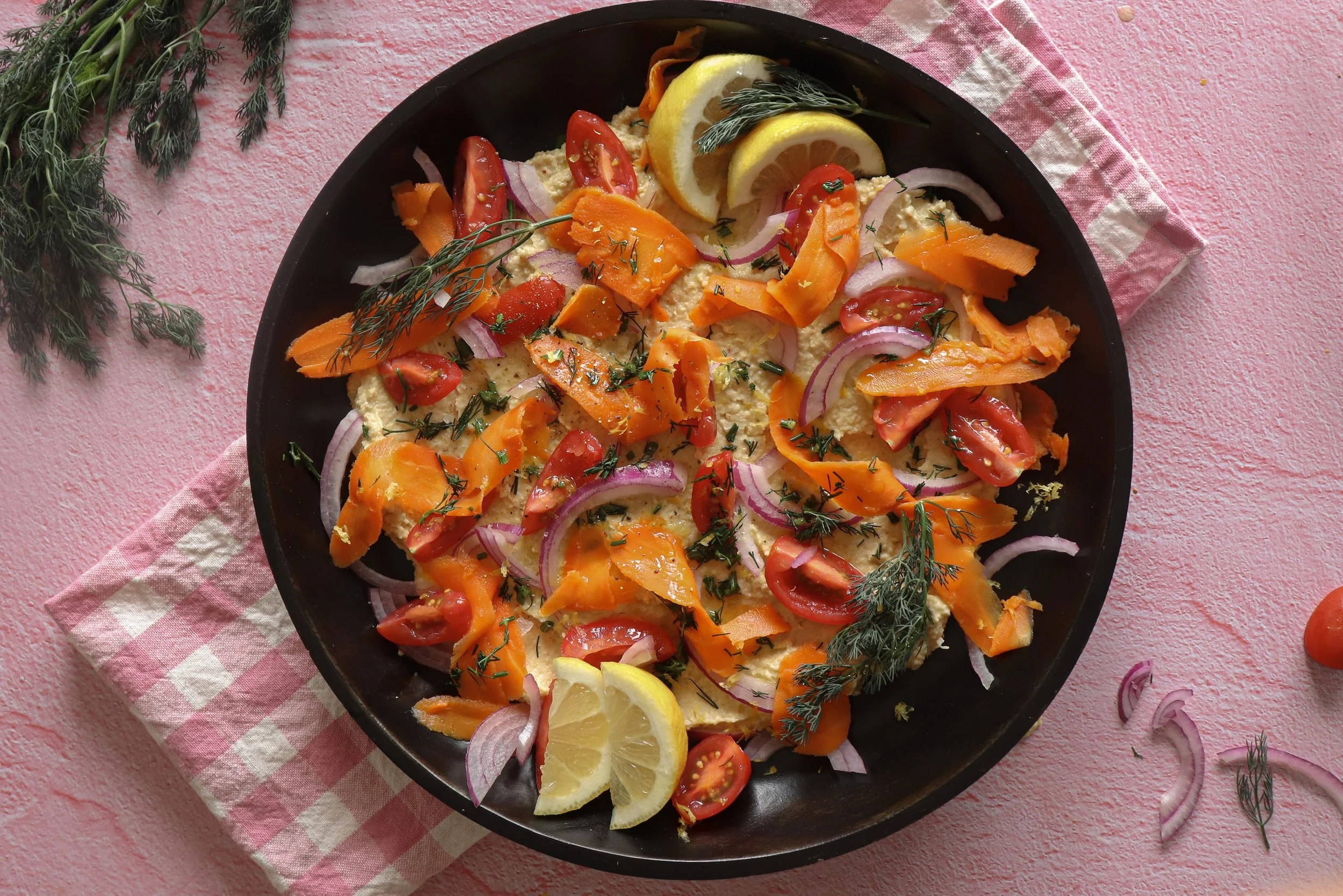 Plateau de ‘‘saumon fumé’’ sur un lit d’hummus